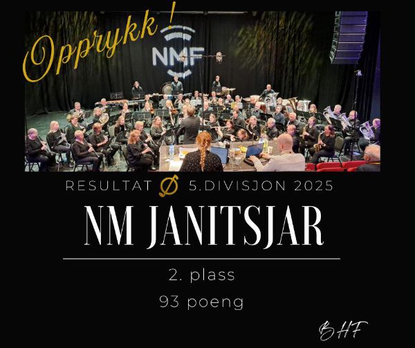 Vi deltok i NM Janitsjar i Trondheim før påske. Vi spilte i 5. divisjon, og det ble pallplass og opprykk til 4. divisjon! Vi er superfornøyde i år også.